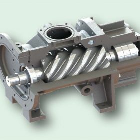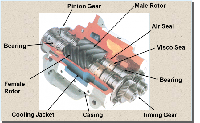 – Khi các trục vít quay nhanh không khí được hút vào trong vỏ thông qua cửa nạp và đi vào buồng khí giữa các trục vít và không khí sẽ được nén bởi các răng khi không khí nhỏ lại và sau đó khí nén đi tới cửa thoát.
