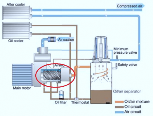 + Mặt khác, không khí đi vào trong máy nén khí sẽ nóng lên, do đó nó cũng làm nóng trục vít và phần vỏ kim loại bao bọc bên ngoài của máy nén khí. Khi mà phần vỏ này nóng quá nhiều, hai trục vít sẽ chạm vào nhau và điều này có thể là nguyên nhân làm cho trục vít bị mòn hoặc vỡ