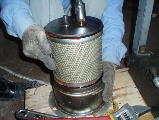 – Trong máy nén khí các bộ phận như: Lọc tách, lọc dầu, lọc gió,…giúp loại bỏ các bụi bẩn, cặn dầu chứa trong không khí khi được đưa vào máy nén khí. Sau một thời gian dài làm việc, các bộ phận này không tránh khỏi các tình trạng tắc nghẽn bởi dầu, bụi bẩn, tình trạng cặn bẩn, dầu nhớt bám dưới đáy và thành lọc, các bụi bẩn được hút vào sẽ bám vào thành xi lanh…khiến bộ lọc không còn hiệu quả, chất lượng lọc kém, làm cho máy hoạt động với hiệu quả thấp, gây ra tình trạng rung lắc, tiếng kêu phát ra từ máy lớn. Chính vì vậy, chúng ta cần vệ sinh các lõi lọc thường xuyên, tốt nhất là vệ sinh sau 6000h hoạt động của lọc hoặc có thể thay sớm hơn tùy thuộc vào điều kiện môi trường làm việc của máy nén khí là có nhiều bụi bẩn hay không.
