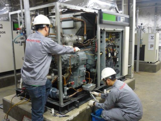 – Khi máy nén khí hoạt động trong một thời gian dài, các bộ phận, thiết bị trong máy sẽ bị hao mòn, hư hỏng dẫn tới tình trạng máy nén khí ngày càng có nhiều tiếng ồn lớn hơn. Đặc biệt, với tình trạng các máy đã sử dụng quá lâu mà không có bất kì công việc bảo trì, bảo dưỡng nào cho máy. Cách tốt nhất là bạn nên bảo trì, bảo dưỡng máy sau 6000-12000h làm việc, tùy thuộc vào khuyến cáo từ các nhà sản xuất.