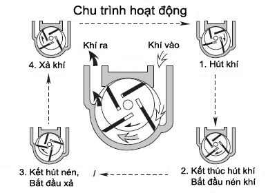 – Sau khi máy được cung cấp năng lượng sẽ bắt đầu vận hành. Các khoang công tác của máy sẽ tiến hành hút bớt chất khí, hơi nước có trong không gian khép kín và đẩy nó ra môi trường không khí bên ngoài. Thể tích của các khoang công tác trong khi máy hoạt động sẽ thay đổi tuần hoàn.