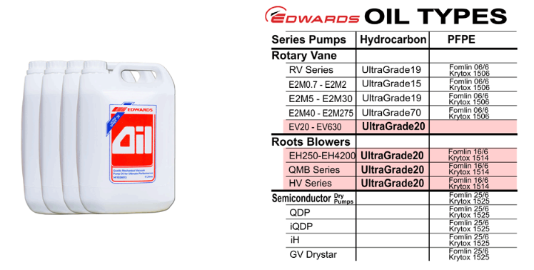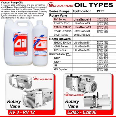 – Dầu bơm chân không Edwards là loại dầu chuyên dùng cho máy bơm chân không của hãng Edwards, gồm các model Ultra grade 15, Ultra grade 19, Ultra grade 20, Ultra grade 70. Trong đó phổ biến nhất là model Ultra grade 19, Ultra grade 20 được sử dụng nhiều nhất cho các model của bơm chân không Edwards.
