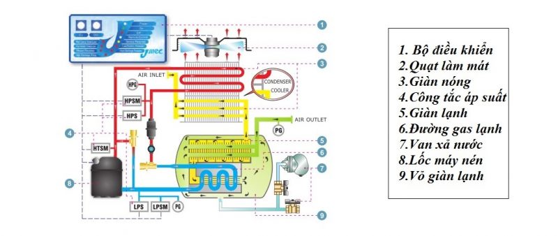 Máy sấy khí tác nhân lạnh bao gồm có 8 bộ phận như sau: