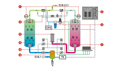 - A,B là hai tháp của máy sấy khí chứa hạt hút ẩm, thông thường có hai dạng hạt hút ẩm chính là hạt Alumium và hạt Silicagel.