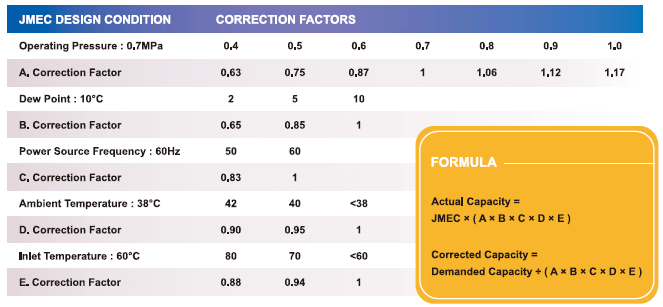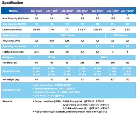 Bảng thông số kỹ thuật các series máy sấy khí Jmec J2E