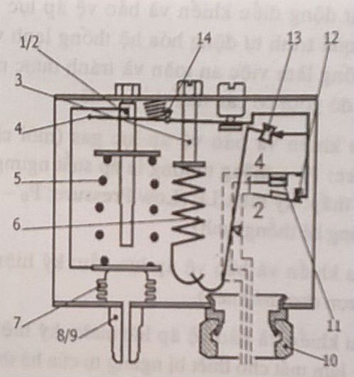 - Vít đặt áp suất thấp 2. Vít đặt áp suất cao 3. Vít đặt áp suất vi sai 4.Tay đòn chính 5. Lò xo chính 6. Lò xo vi sai 7. Hộp xếp 8.Đầu nối áp suất thấp 9. Đầu nối áp suất cao 10. Lối luồn dây điện 11. Tiếp điểm điện 12. Tay đòn 13. Cơ cấu lật 14. Gối đỡ