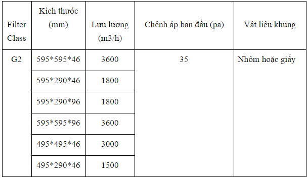 – Tiêu chuẩn: EN 779 lớp G3-G4